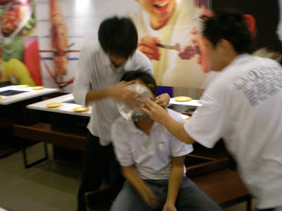 Mon, sch as usual la.. But during pract, felt smthing wrong as dey held me back, instead of leaving.. hahas, thanks to my peeps frm 1B03 for getting a cake n celebrating.. though obviously we made a mess of e T15 study area... ALSO thanks to sherwinwho personally hand me a cake b4 class.. thanks bro.. Later met shawn n jing at fc4.. N ms chen lost her way frm dover mrt!.. lols.. But anw, thanks 4 coming down to celebrate wif cakes.. ~ V tasty.. =D n jing i bet u regret coming to sp ryt?.. esp e suanning session we had.. Met up wif e rest of e guys tgt wif yishan at bugis.. Thanks 4 e Adidas shoe u all got 4 me aye.. Proceeded to seoul garden 4 dinner.. ~ abit ex la + e strange strange thing was e new seoul garden use heater no fire, half e fun lor!.. Anw, we made e best of it & had a fun-filled dinner.. played e "zong-chi-mi-ma" game (guess-the-number), mixed up a "yummy" soup as e jackpot.. hahas, poor sherwin kana thrice... Later when e crowd left came e 'fun" part, cut cake laa.. tio smashed lik siao, twice back to back.. lols.. ~nice clean fun la, except seoul garden crew gona hav hard time cleaning.. =P Oh yes, EMM wana thankU 4 coming down, tio surprised la.. + bringing e cake too.. Ola! though e cake was rather ex to kana wasted..